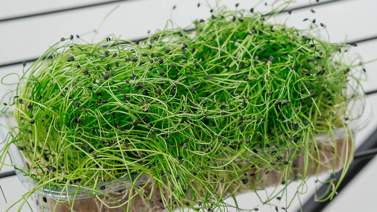 Onion microgreens are one of the more unique-looking choices. These long, skinny greens hang onto their black seed husks, which gives them a polka-dotted look. The husks are edible and said to have a garlic taste. The onion microgreens themselves are savory and have a stronger onion flavor than you’d think. They taste delicious when prepared like chives or chopped green onions.