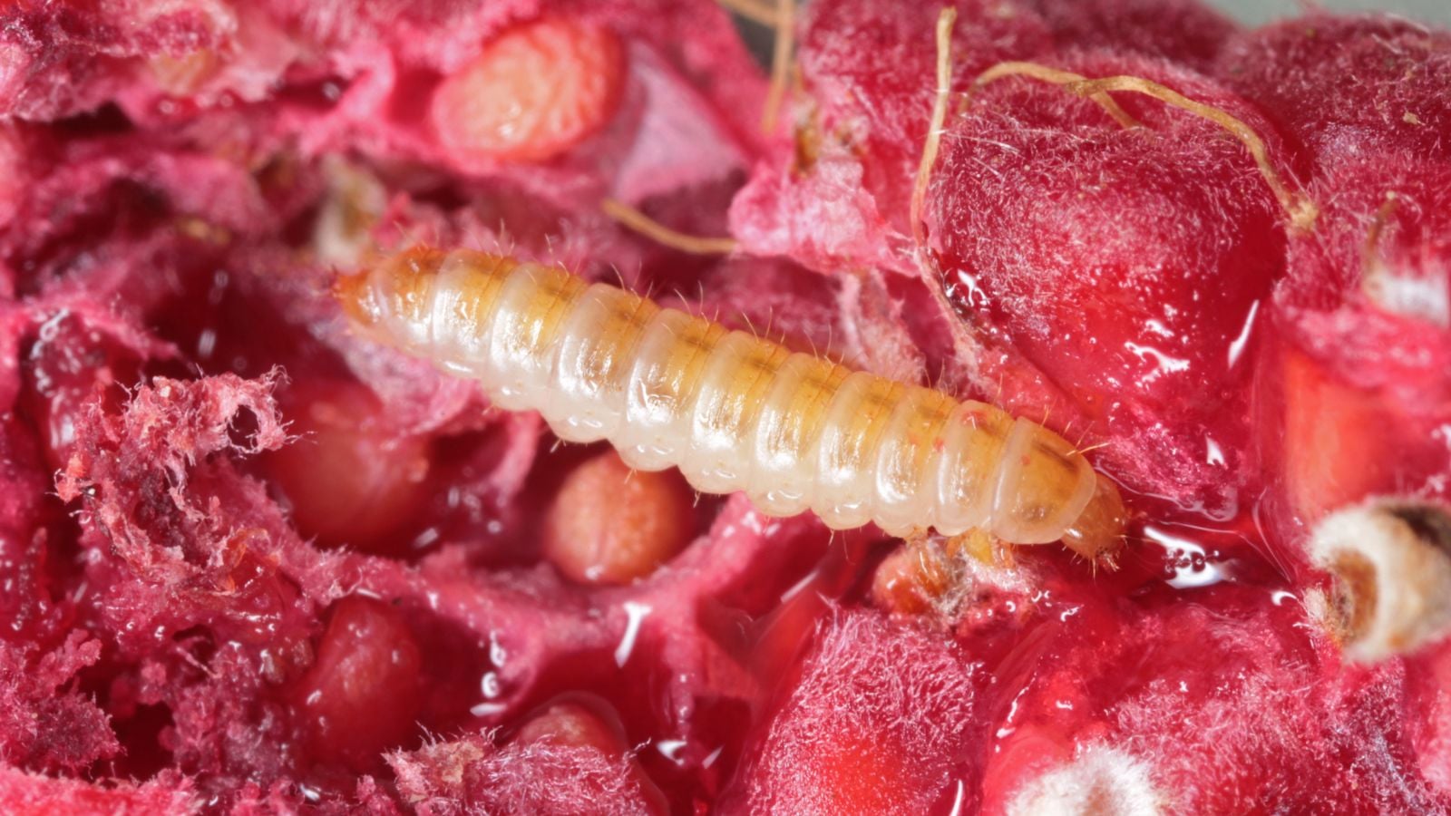 The larval stage typically takes 30-40 days. Fruitworms will pupate and become full adult beetles in the autumn after mature fruits drop to the ground.