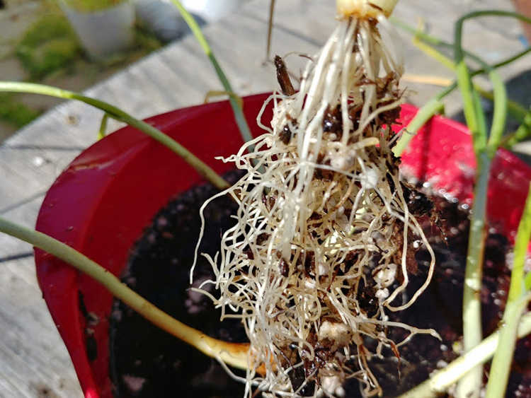 There’s no visual indication of where the onion roots might start, or to which plant they belong. All you can see is a tangle of roots with no apparent end in a squared-off clump.